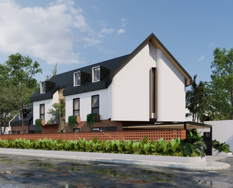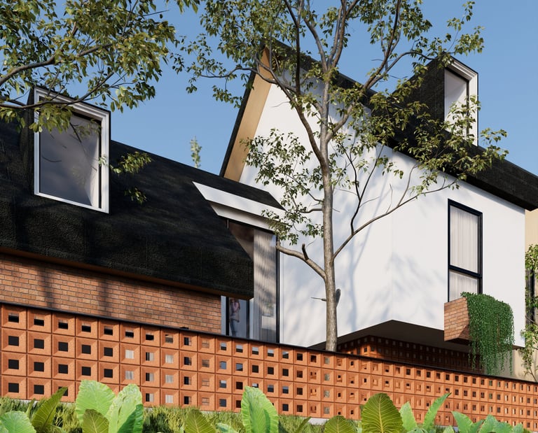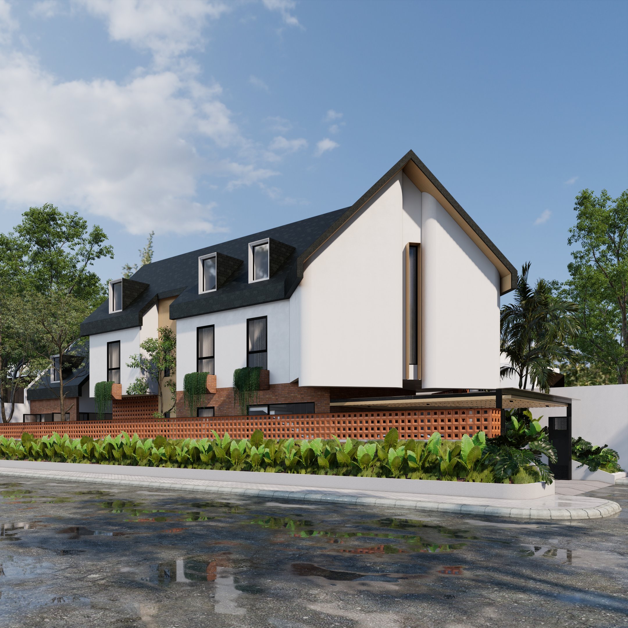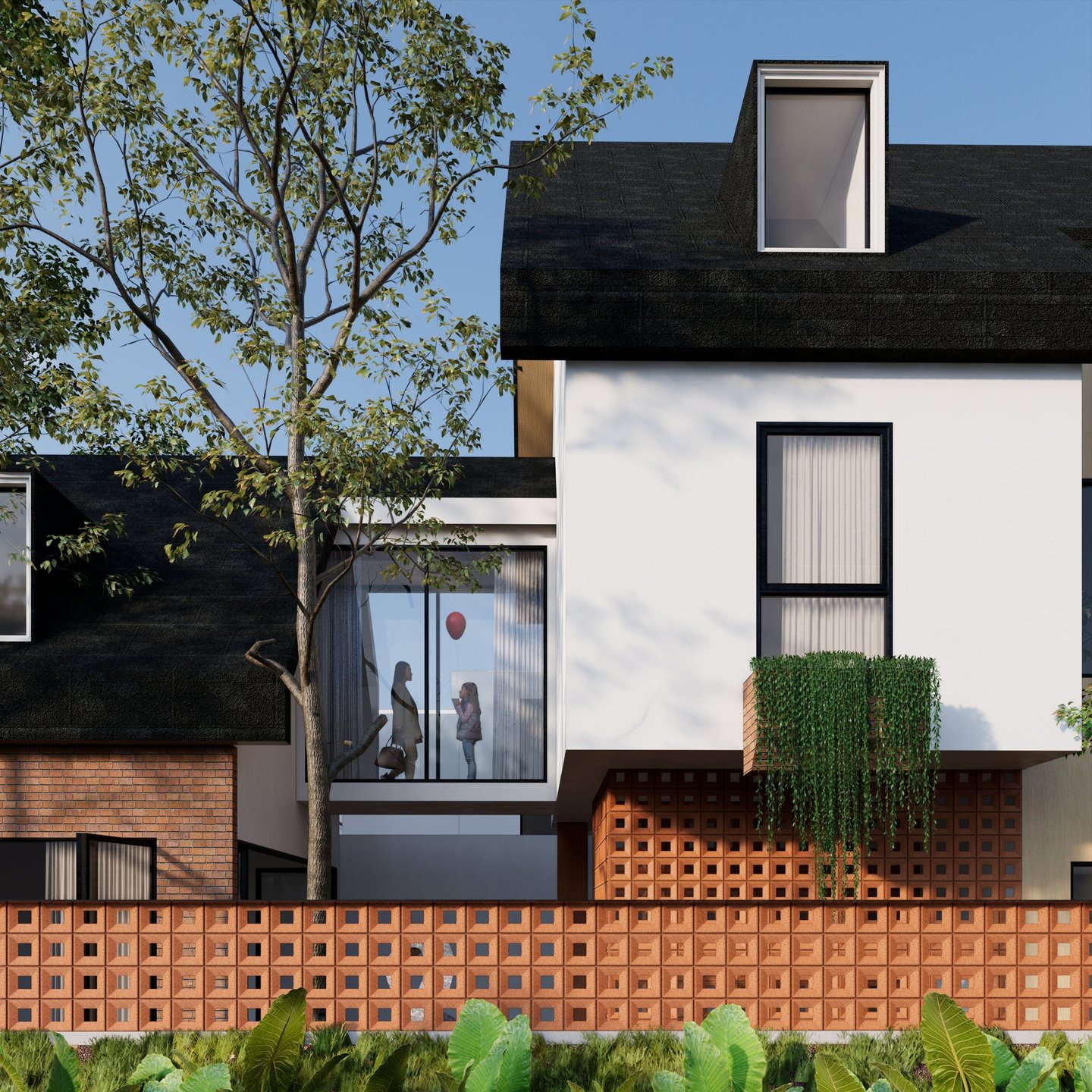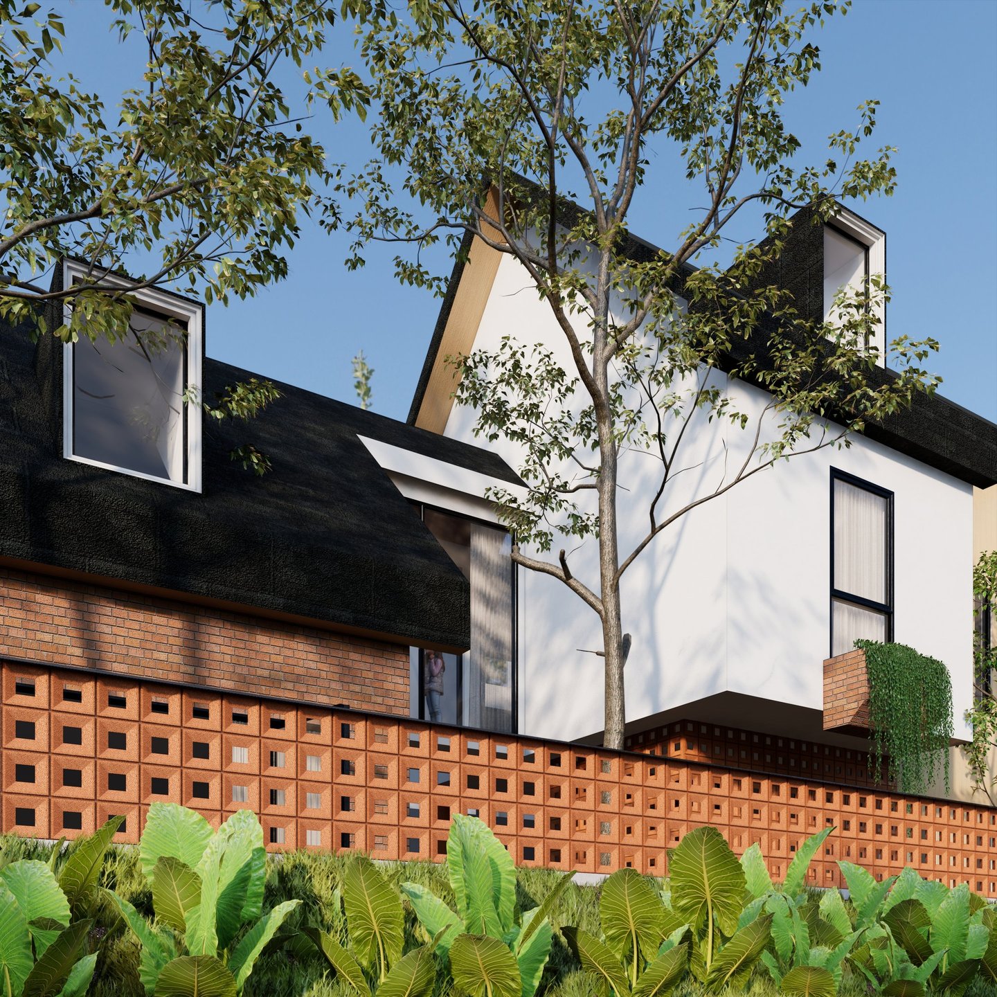 Rumah ini mengusung pendekatan desain Skandinavia yang bersih dan fungsional, namun diperkaya dengan sentuhan arsitektur Eropa, salah satunya melalui elemen jendela dormer yang memberikan karakter khas pada atap. Sesuai dengan keinginan klien, fasad rumah ini juga diperkuat dengan penggunaan roster berwarna bata dan dinding bata ekspos, yang tidak hanya berfungsi sebagai elemen dekoratif tetapi juga memberikan kesan hangat dan alami pada tampilan luar bangunan.