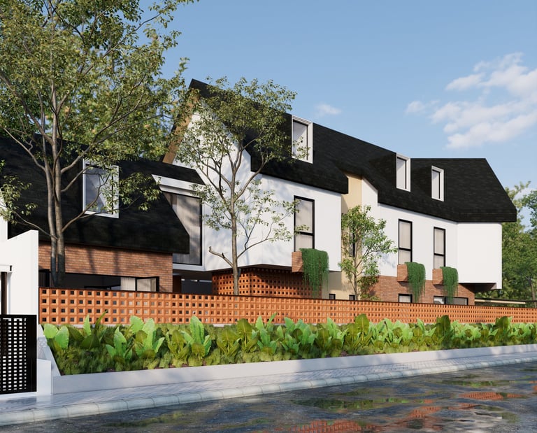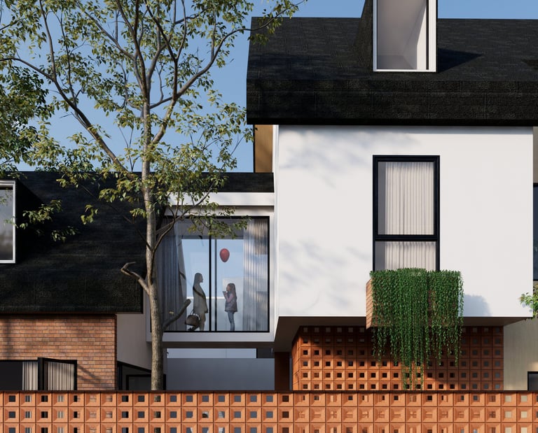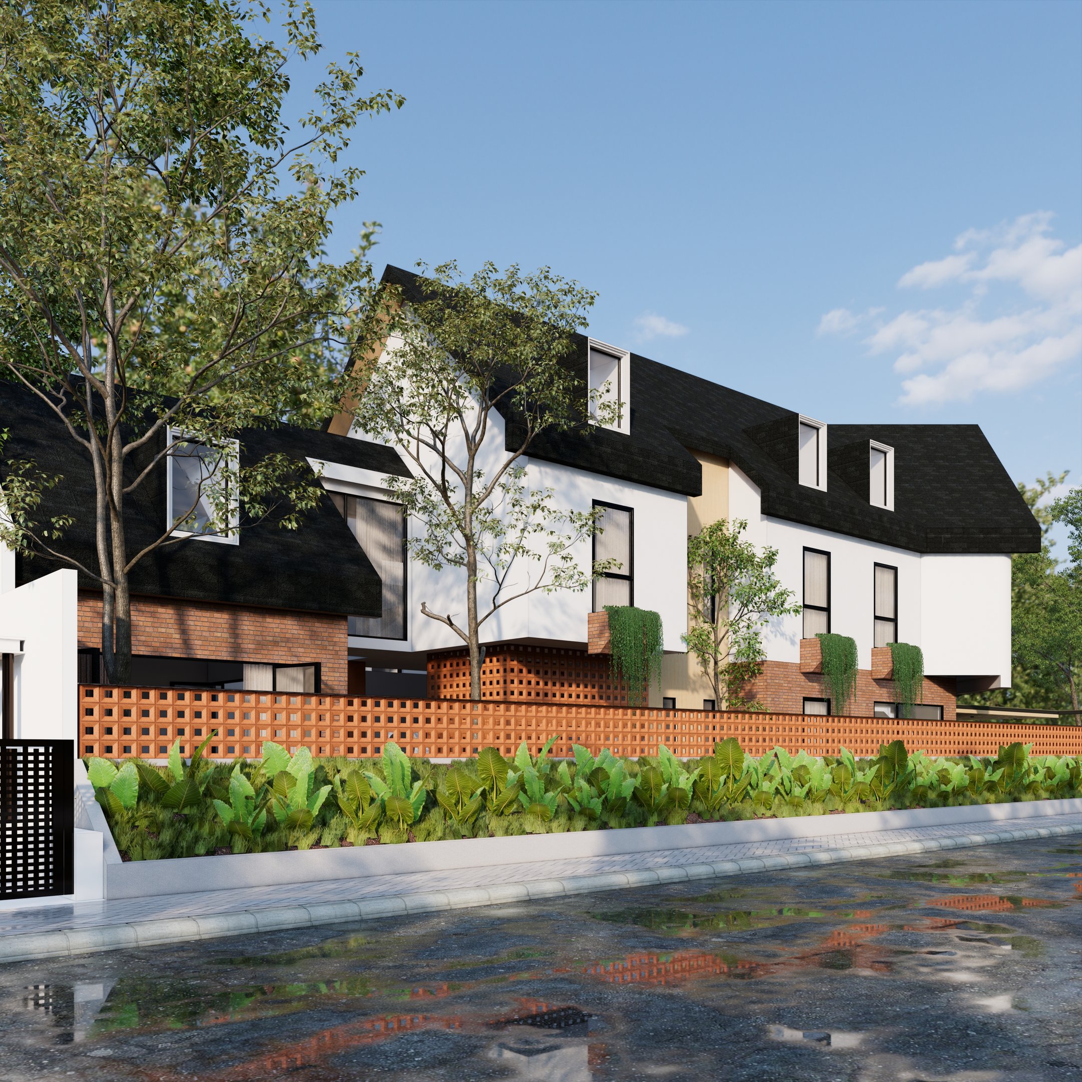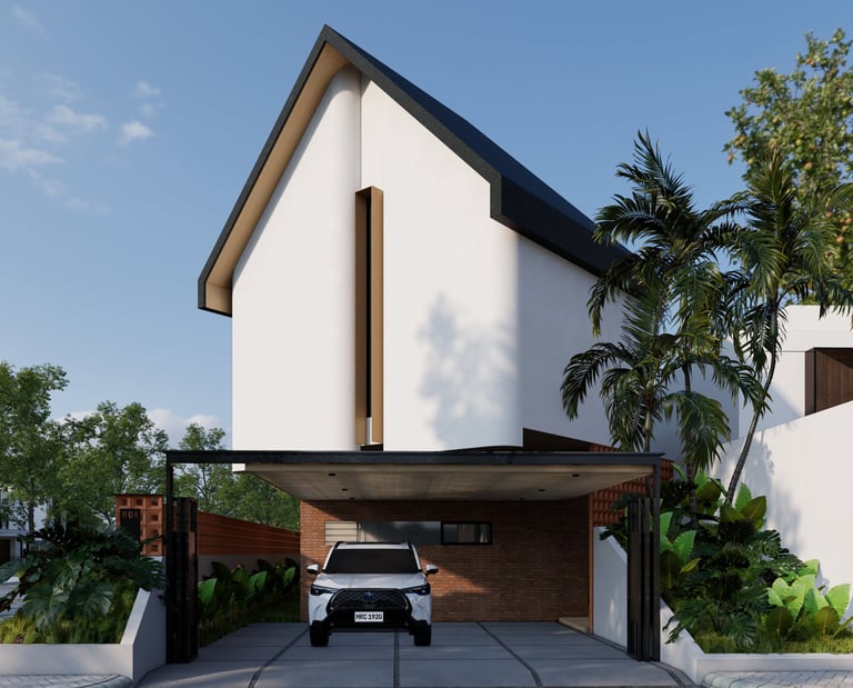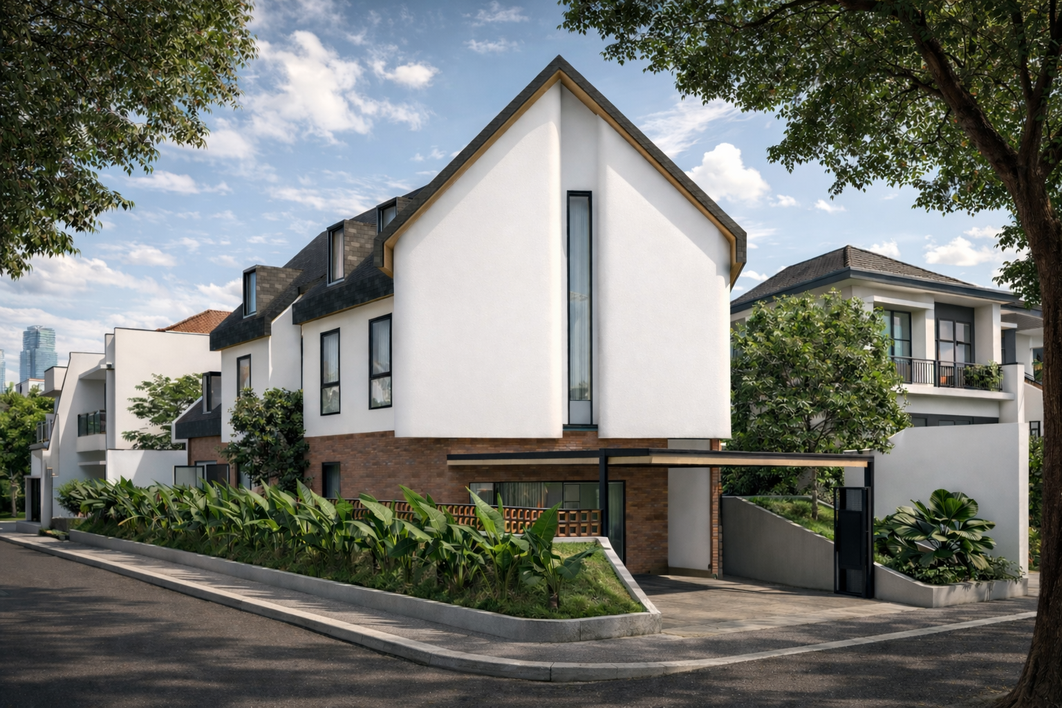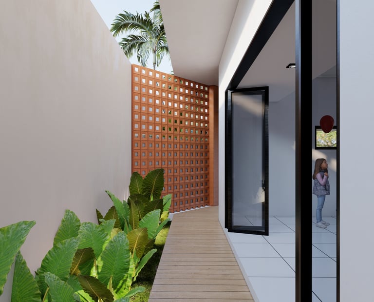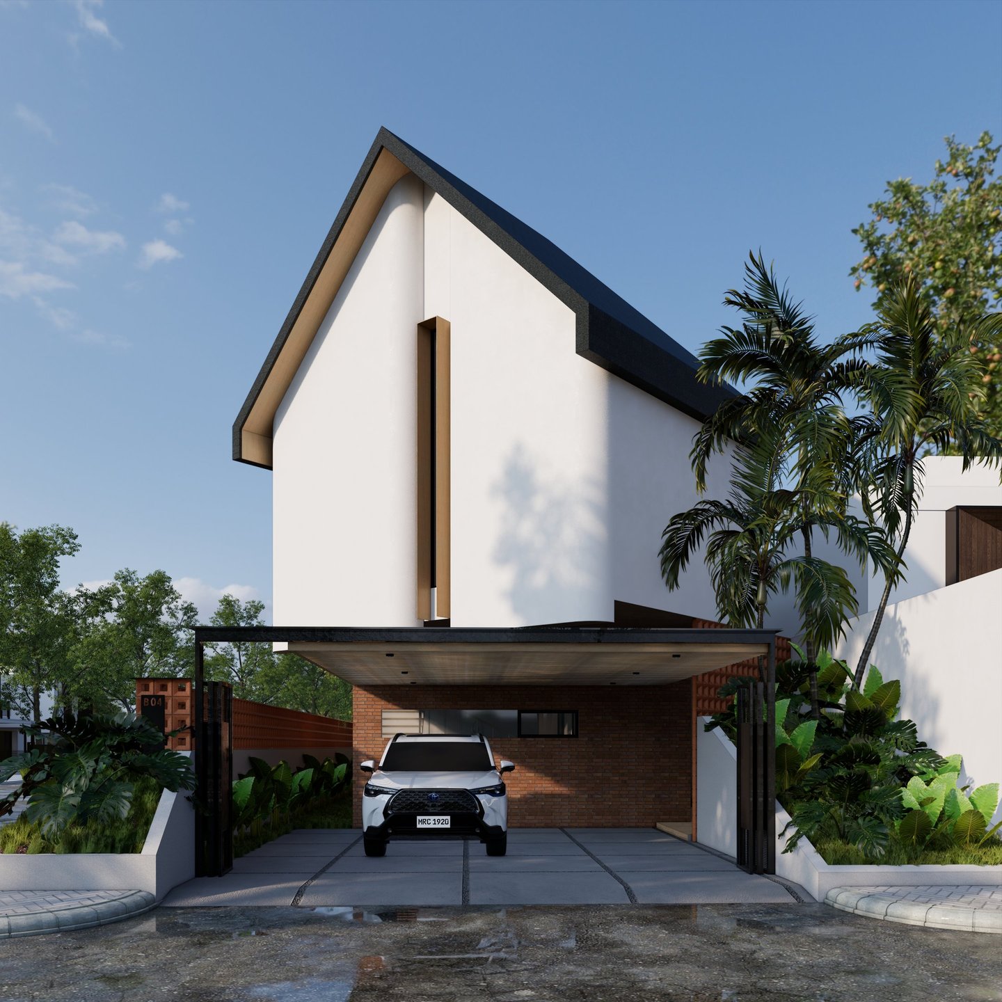 Rumah ini mengusung pendekatan desain Skandinavia yang bersih dan fungsional, namun diperkaya dengan sentuhan arsitektur Eropa, salah satunya melalui elemen jendela dormer yang memberikan karakter khas pada atap. Sesuai dengan keinginan klien, fasad rumah ini juga diperkuat dengan penggunaan roster berwarna bata dan dinding bata ekspos, yang tidak hanya berfungsi sebagai elemen dekoratif tetapi juga memberikan kesan hangat dan alami pada tampilan luar bangunan.