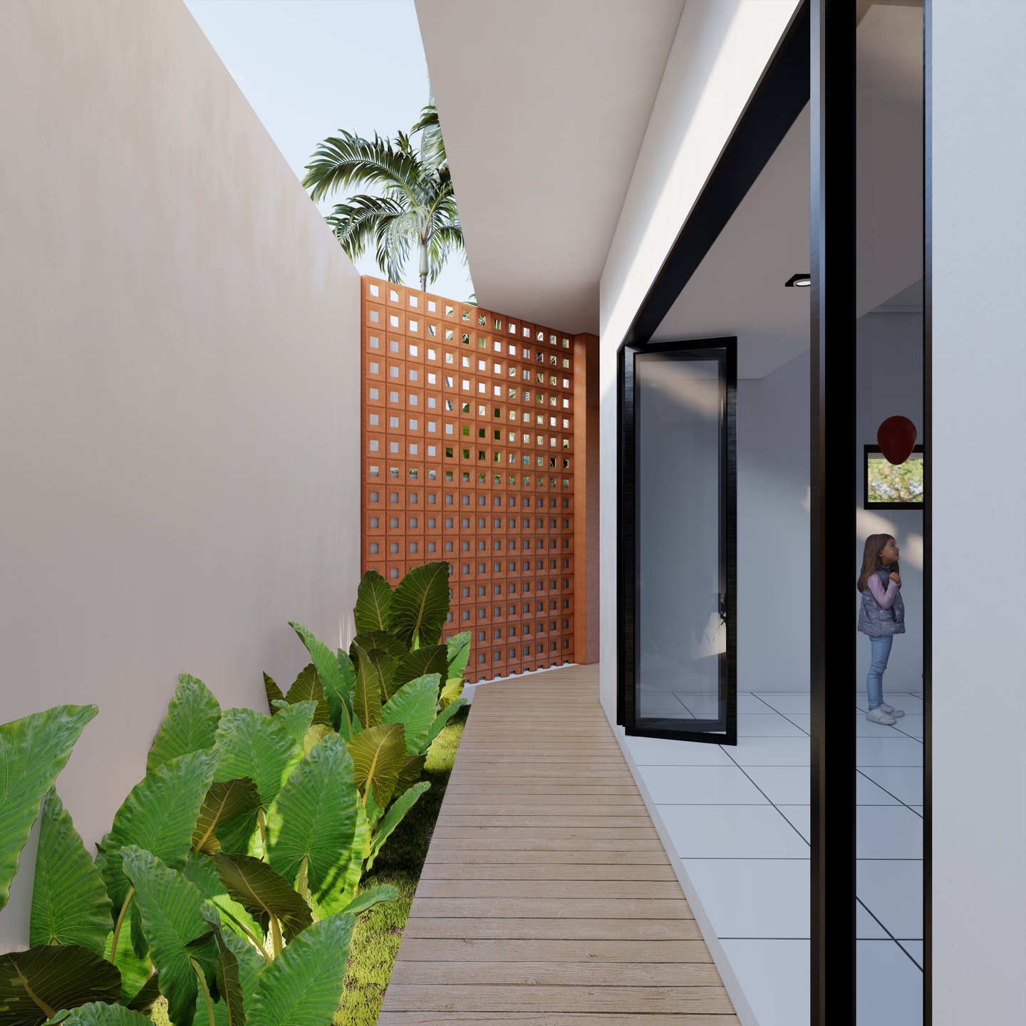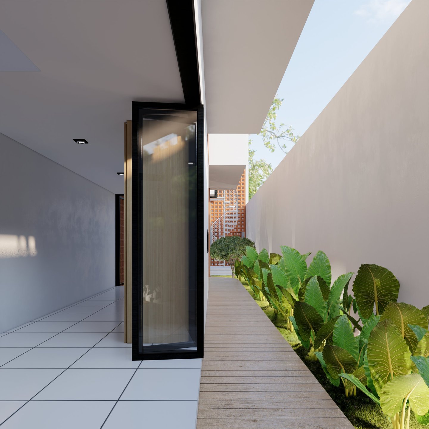 Pengunjung yang datang akan melewati koridor terbuka yang dipenuhi dengan tanaman hias, menciptakan suasana transisi ruang yang menyegarkan sebelum memasuki area tamu.