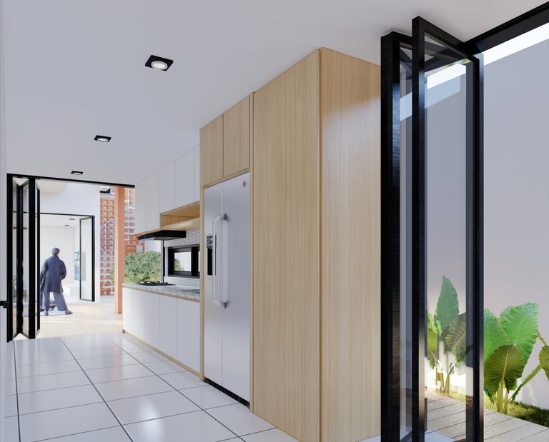 Masih di lantai ini, terdapat ruang makan, serta area servis yang disusun lebih privat di bagian belakang rumah. Area ini dibingkai dengan dinding roster bata, sehingga tetap memiliki sirkulasi udara yang baik namun tersembunyi secara visual.